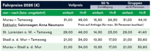 Ticketpreise: wie für planmäßige Dampfzugfahrten nach Tamsweg in der Saison 2026. Siehe Tabelle oben.