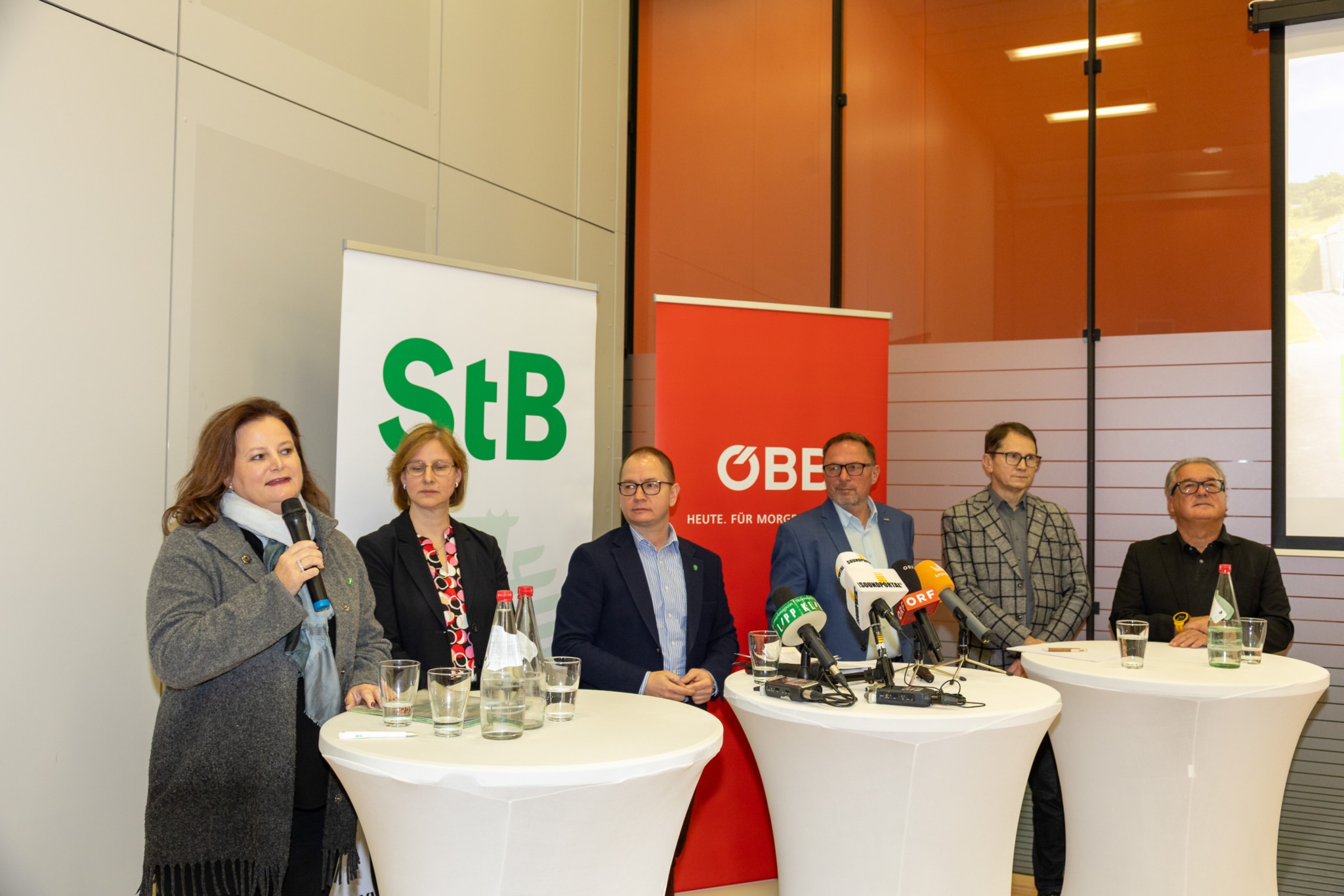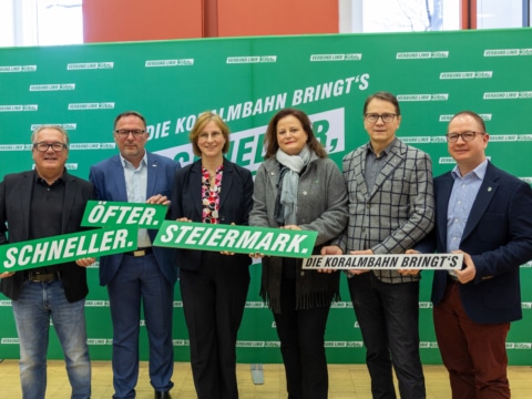 - Am Foto v.l.n.r.: Geschäftsführer Verkehrsverbund Steiermark Peter Gspaltl, Geschäftsführer Verkehrsverbund Steiermark Peter Wallis, ÖBB-Regionalmanager Steiermark Barbara Kleinert, Geschäftsführerin GKB Verkehrslandesrätin Mag. Dr. Claudia Holzer, LL.M. DI Bernhard Breid, Leiter Referat Öffentlicher Verkehr Land Steiermark Mag. (FH) Ronald Kiss, Direktor Steiermärkische Landesbahnen