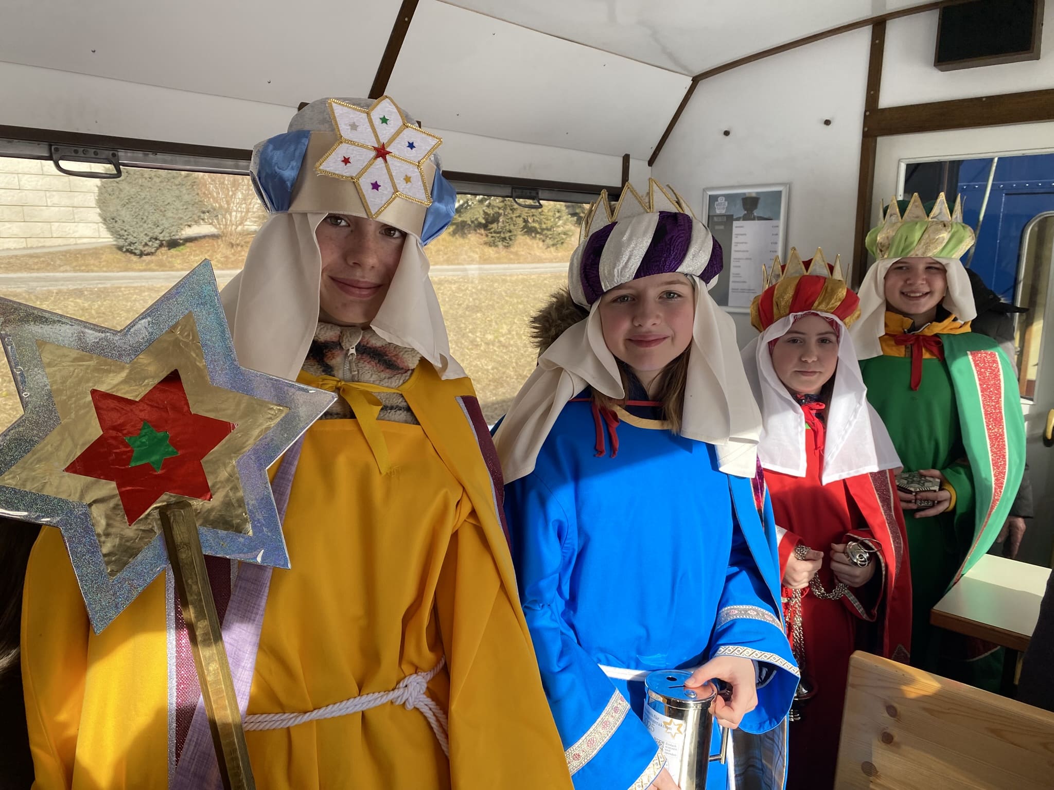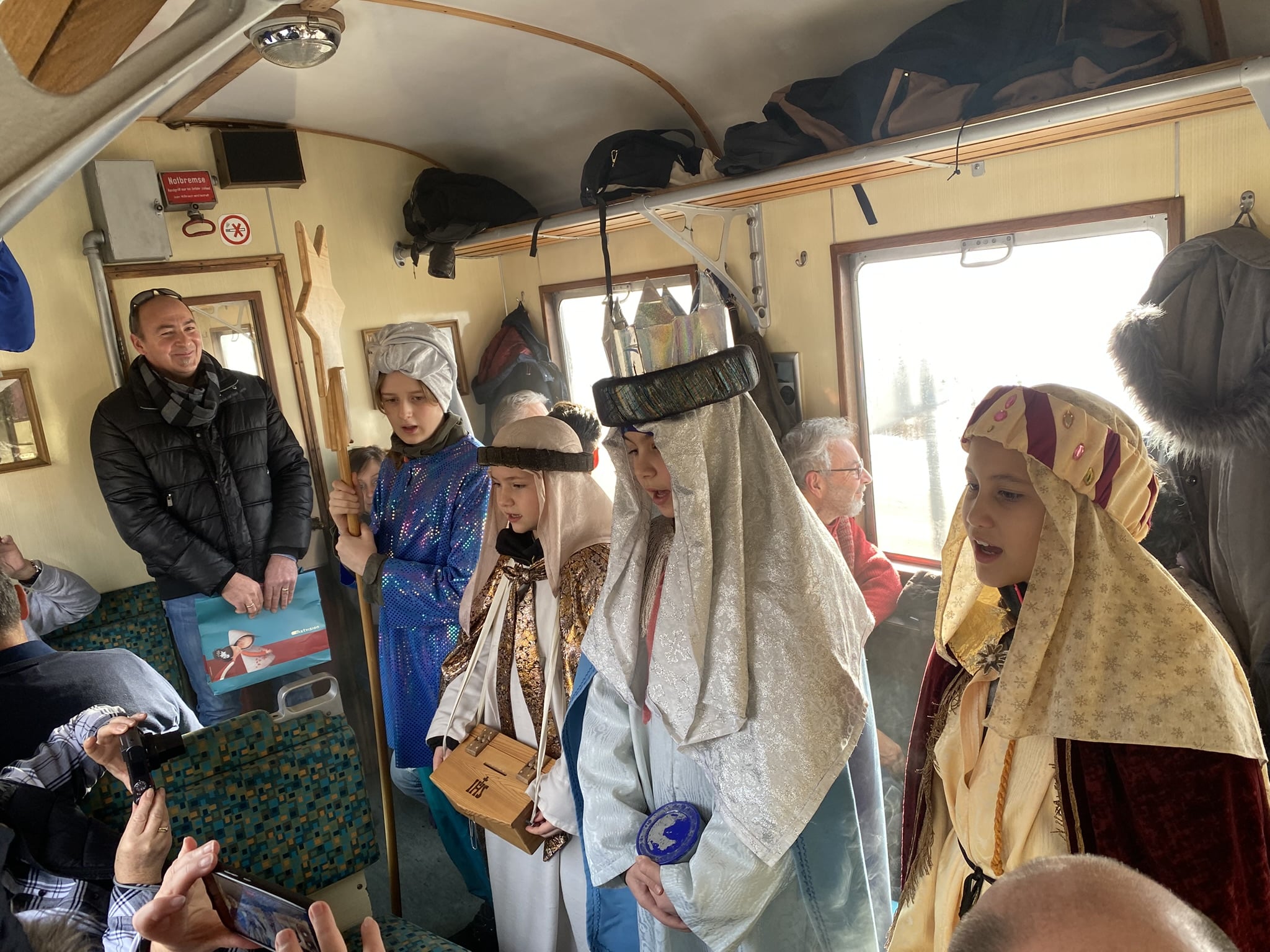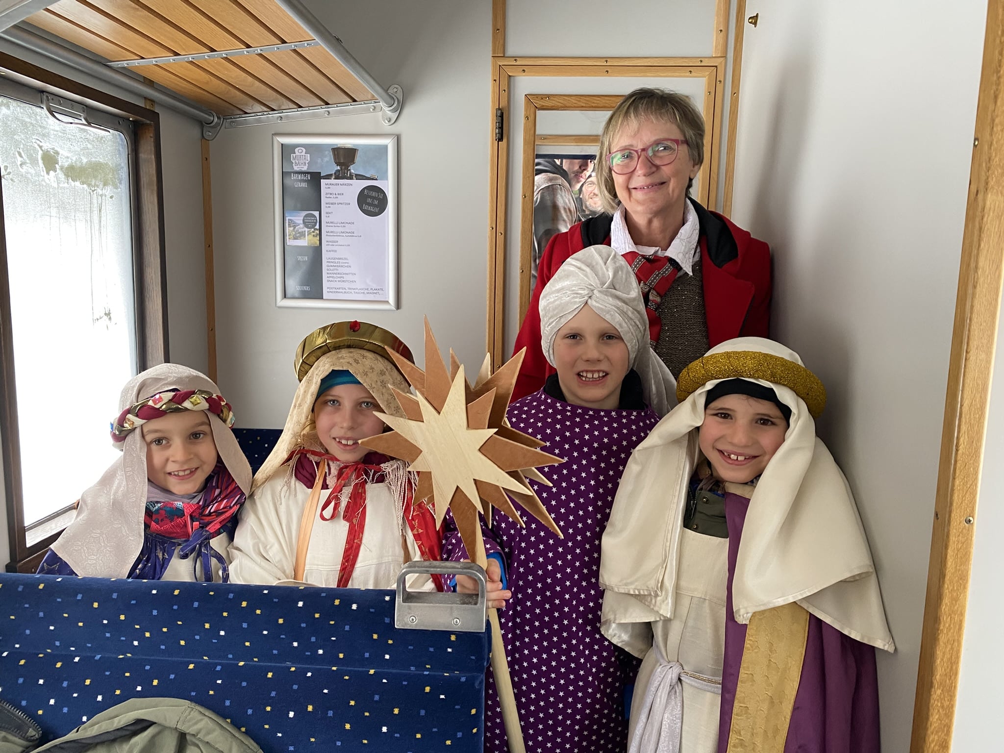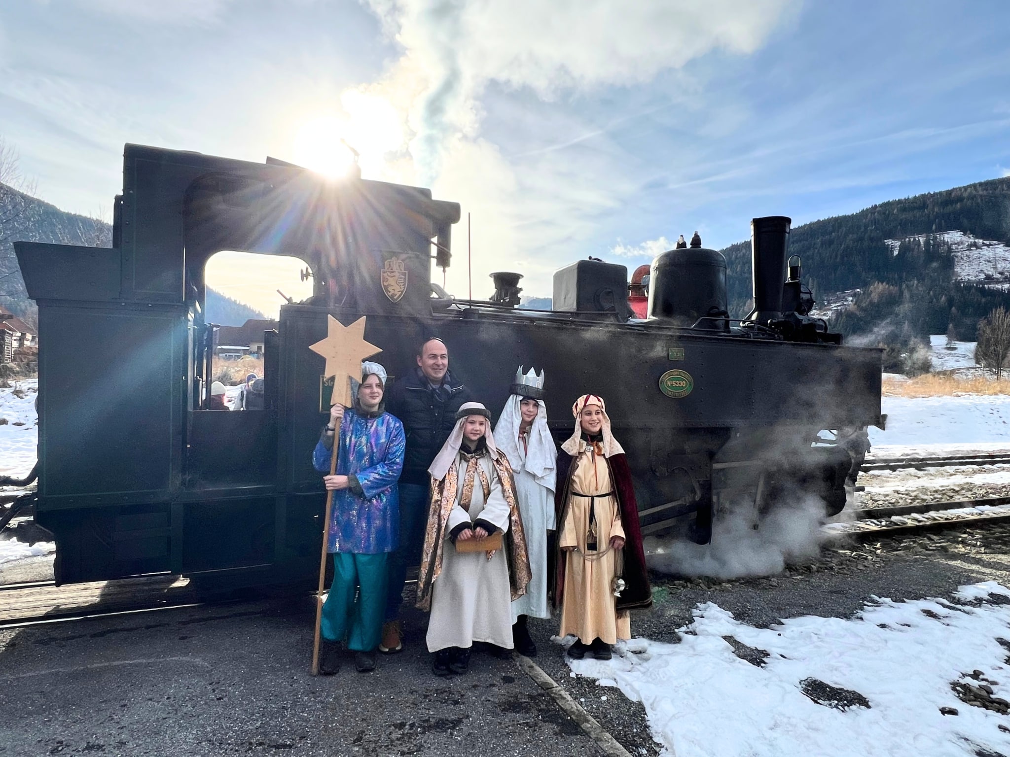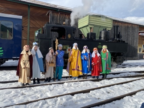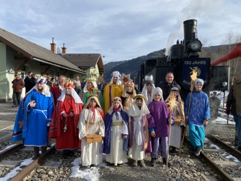 Ein wahrhaft königliches Dampfzugerlebnis gab es gestern erstmalig für alle Fahrgäste des Murtalbahn Dampfzuges. Am Dreikönigstag waren die Sternsinger nicht wie gewohnt zu Fuß unterwegs, sondern sie reisten mit unserem Dampfzug von Murau nach Tamsweg. In den Waggons erklangen ihre weihnachtlichen Lieder und die guten Wünsche für das neue Jahr. Unsere Fahrgäste waren sichtlich erfreut über den königlichen Besuch, der nicht nur für das Ohr, sondern aufgrund der schönen Gewänder auch für das Auge etwas bot. Dreikönigs-Punsch, Lebkuchen und musikalische Begleitung rundeten das Fahrerlebnis ab. Auch die Sonne ließ die verschneite Winterlandschaft entlang der Mur erstrahlen, was diese Dampfzugfahrt zu einem ganz besonderen Erlebnis machte.